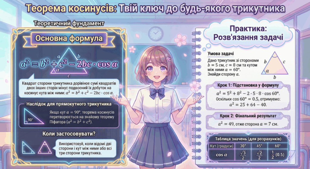 Квадрат сторони трикутника дорівнює сумі квадратів двох інших сторін мінус подвоєний добуток цих сторін і косинуса кута між ними.