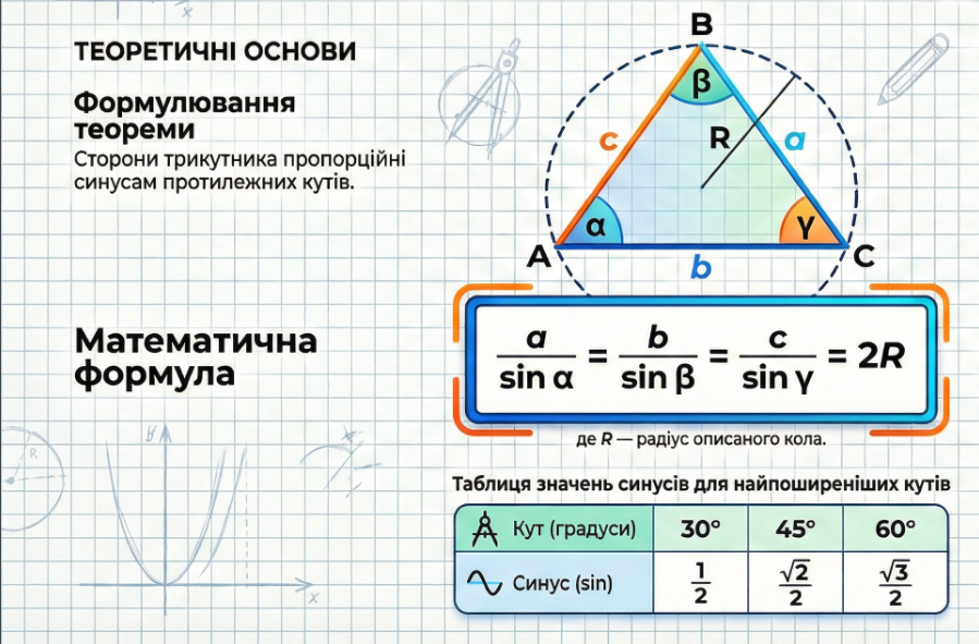 Теорема синусів Геометрія 9 клас 28.02.202628.02.2026| olgaolga| Немає коментаря| 22:08 Категорії: 9 клас Геометрія Формулювання теореми синусів Сторони трикутника пропорційні синусам протилежних кутів. Залишити відповідь Скасувати коментарВаша e-mail адреса не оприлюднюватиметься. Обов’язкові поля позначені *Коментар * Ім'я * Email * Сайт Зберегти моє ім'я, e-mail, та адресу сайту в цьому браузері для моїх подальших коментарів. Навігація записів PREVIOUS Попередній запис: Площа трикутника Геометрія 9 класNEXT Наступний запис: Теорема косинусів Геометрія 9 клас Related Post Рівнобедрений трикутникРівнобедрений трикутник 12.07.202412.07.2024| olgaolga| Немає коментаря| 14:44 Читати даліЧитати далі ВекториВектори 21.08.202221.08.2022| olgaolga| Немає коментаря| 14:00 Вектори називаються рівними, якщо вони співнапрямлені і рівні за довжиною. Читати даліЧитати далі Теорема ПіфагораТеорема Піфагора 30.04.202530.04.2025| olgaolga| Немає коментаря| 17:55 Читати даліЧитати далі