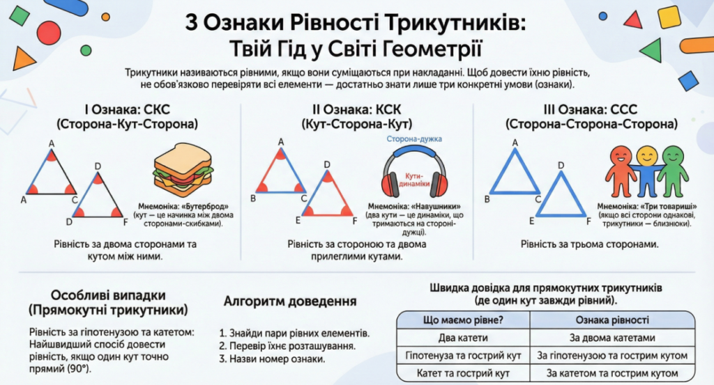 Третя ознака рівності трикутників (за трьома сторонами). Якщо три сторони одного трикутника дорівнюють відповідно трьом сторонам другого трикутника, то такі трикутники рівні.